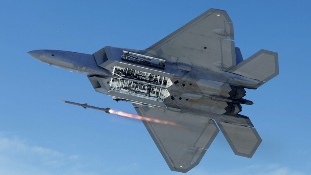 The F-22 also carries a formidable array of weapons systems including AIM missiles, JDAM bombs, external fuel tanks, air launch cruise missiles (ALCM), and joint direct attack munitions (JDAM).